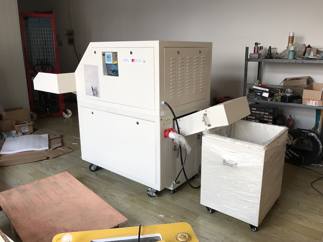 蘋果公司包材供應商――蘇州工業園區明揚彩色包裝印刷有限公司 蘇州工廠采購越都輸送帶式大型碎紙機產品用于粉碎蘋果手機包裝余料產品