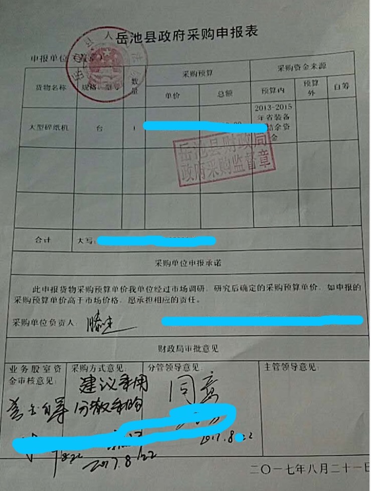 四川省岳池縣人民法院 岳池縣政府大型碎紙機采購申報表