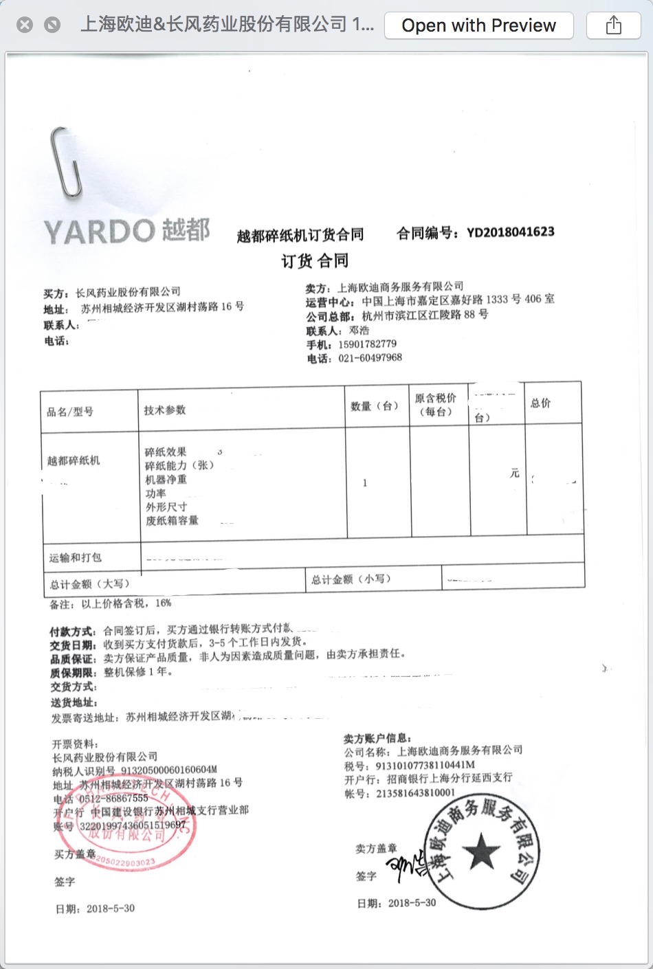 越都制藥業(yè)大型碎紙機(jī):上海歐迪&蘇州長(zhǎng)風(fēng)藥業(yè)股份有限公司訂購(gòu)越都碎紙機(jī)合同