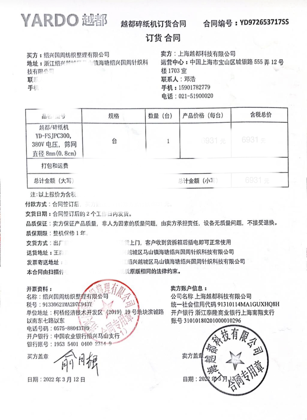 上海越都科技有限公司與紹興國周紡織整理有限公司簽訂協議,位于浙江紹興越城區馬山鎮海塘紹興國周針織科技有限公司選擇了越都YD-FSJ系列大型碎紙機,用于工廠保密文件銷毀工作 #保密文件銷毀 #大型碎紙機