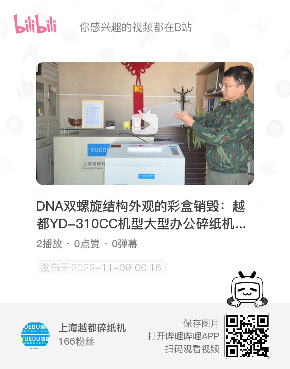 查看銷毀視頻:【DNA雙螺旋結構外觀的彩盒銷毀:越都YD-310CC機型大型辦公碎紙機,粉碎彩盒包裝箱,順豐速運包裝盒子,EMS和順豐快遞包裝袋,完全銷毀裝有紙張的透明塑料文件-嗶哩嗶哩】 https://b23.tv/Ic7q2V8